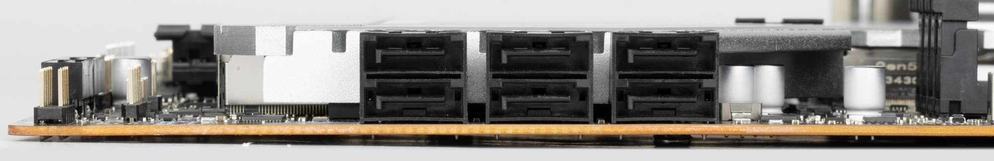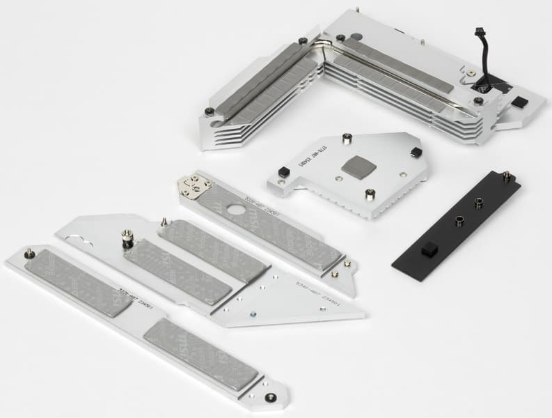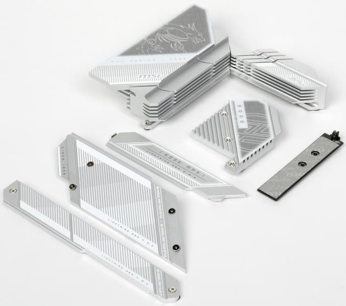 Все M.2 слоты имеют радиаторы. Верхний M.2_1 обладает отдельным радиатором, когда как остальные слоты M.2 имеют общие радиаторы (у М.2_2 и M.2_5 общий радиатор с чипсетом).