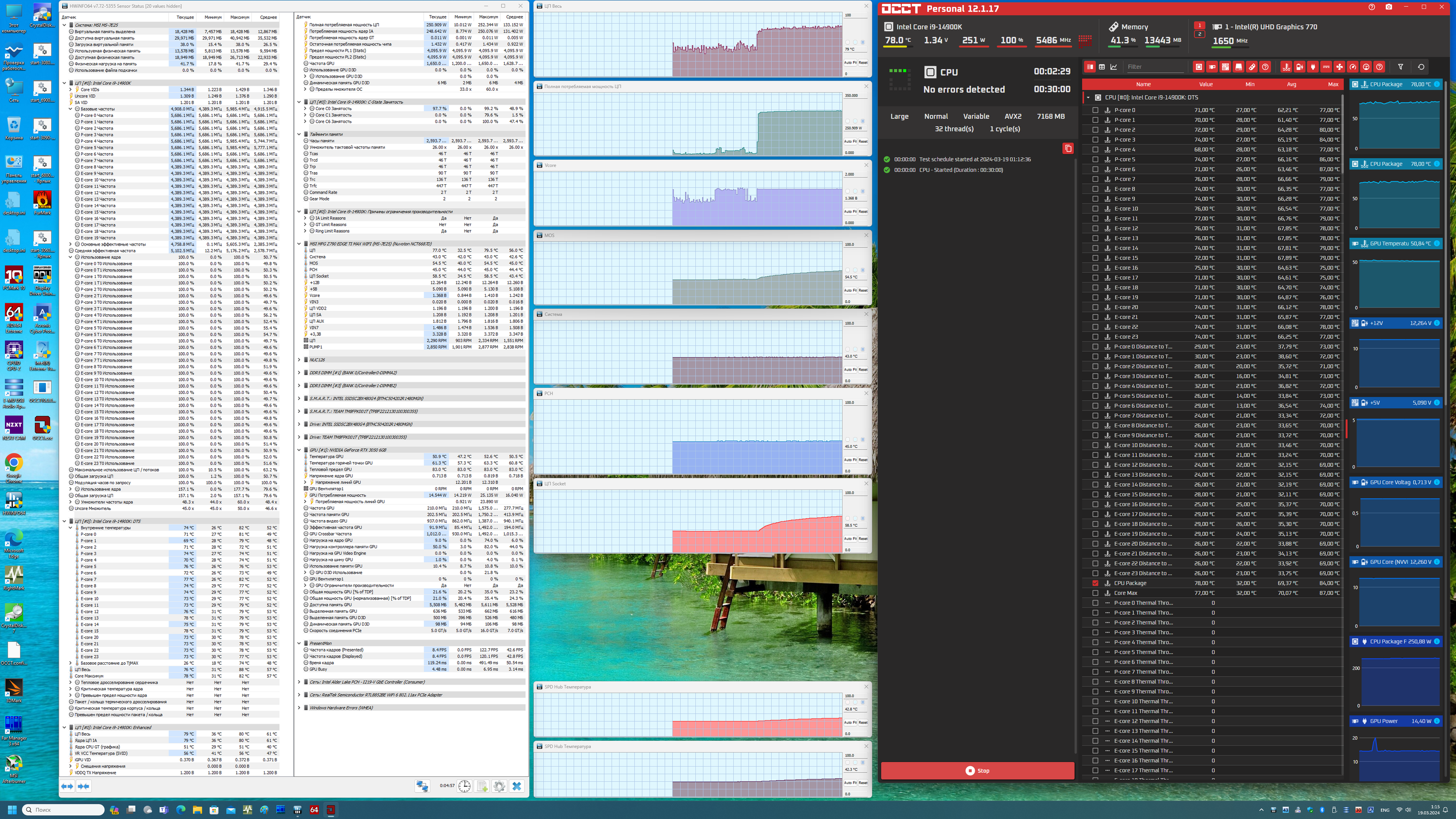 В режиме авторазгона мы получили 5.7 ГГц по всем P-ядрам, и 4.4 ГГц по всем Е-ядрам. Напомню, что Р-ядра — это обычные всем привычные ядра, имеющие по 2 потока каждый, «Р» — означает Performance, то есть производительные. «Е» — это энергоэффективные ядра, так называемые, малые ядра, у них по 1 потоку. В целом мы видим, что система по умолчанию, определив мощное питание матплаты, выставила очень приличный авторазгон. Все остальные параметры системы по нагреву компонентов были в норме. И стоит отметить, что потребление CPU уже вышло за 250 Вт.