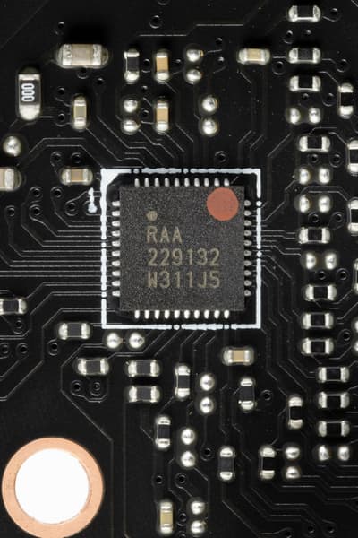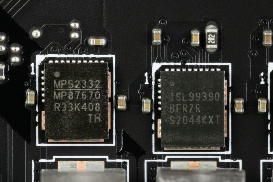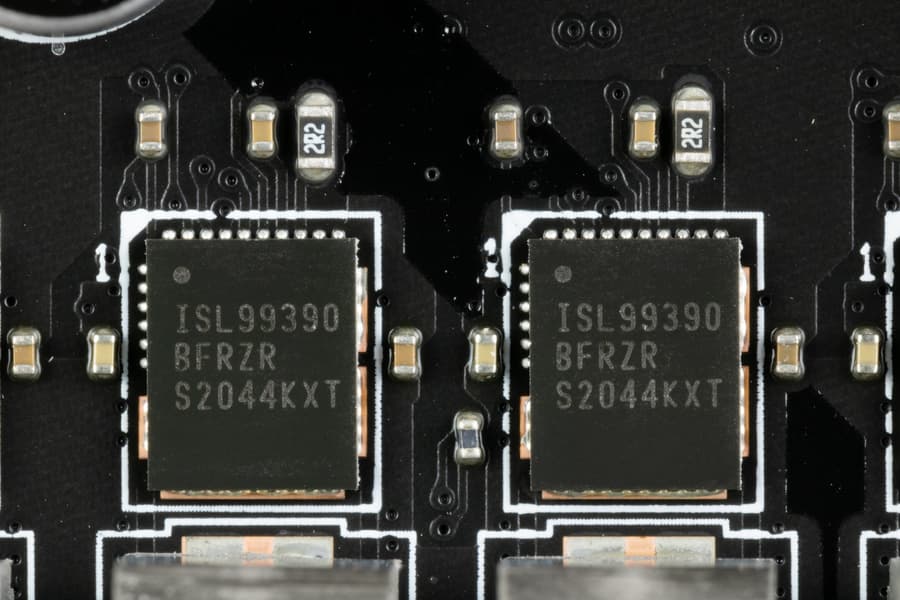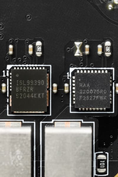 Каждый канал фазы имеет суперферритовый дроссель и RAA 220075RO MOSFET от Renesas на 75 А для встроенного графического ядра, ISL99390 (90A, Renesas) для VCore и MP87670 от Monolithic Power Systems для VCCIO на 70А.