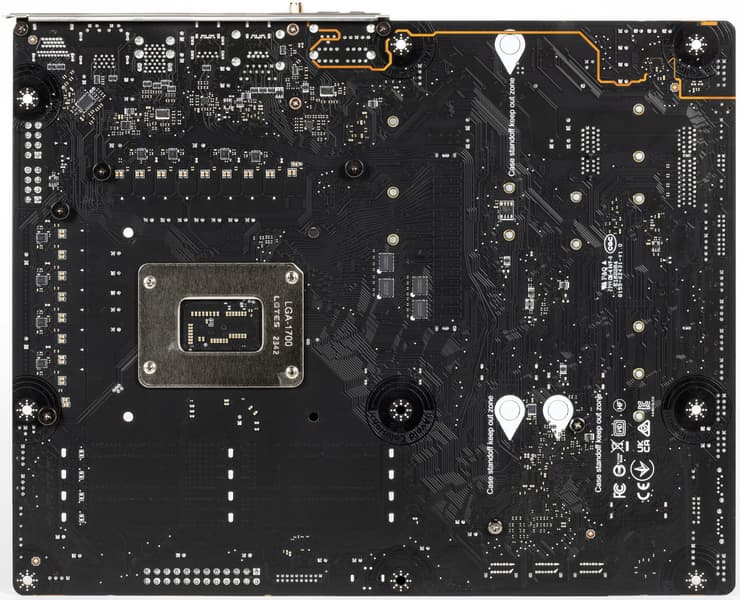 По традиции у всех плат от MSI на оборотной стороне обозначены места, где могут оставаться ненужные в данный момент крепежные втулки (чаще всего латунные), на которые обычно ложится матплата в корпусе, и к которым ее прикручивают. Эти места отмечены белой краской, и нарочно в них нет никаких электропроводных элементов, чтобы в случае установки матплаты не было случайных замыканий или повреждений от лишней крепежной втулки.