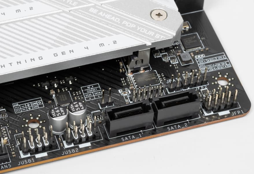 Всего у платы 8 разъемов Serial ATA 6 Гбит/с + 5 слотов для накопителей в форм-факторе M.2. Порты SATA странно промаркированы: 1, 2, 5, 6, 7, 8, A1, A2. 6 из них реализованы через чипсет Z790 и поддерживают создание RAID. При этом порты SATA 1 и 2 делят ресурсы с портом М.2_3.