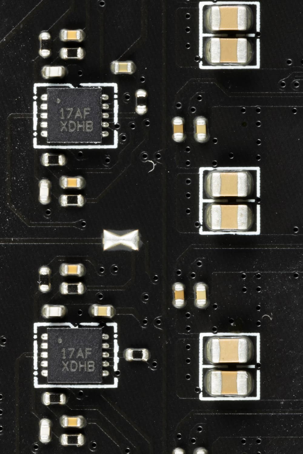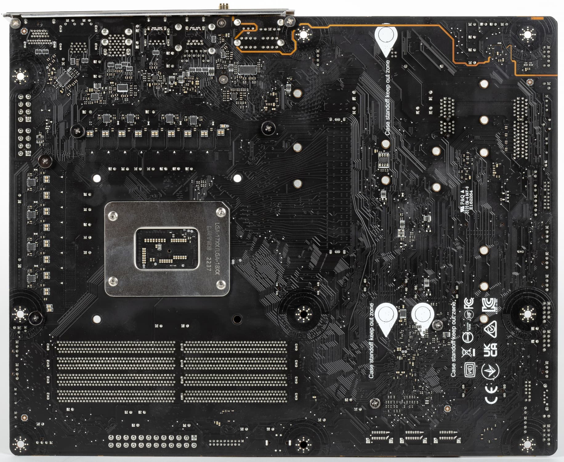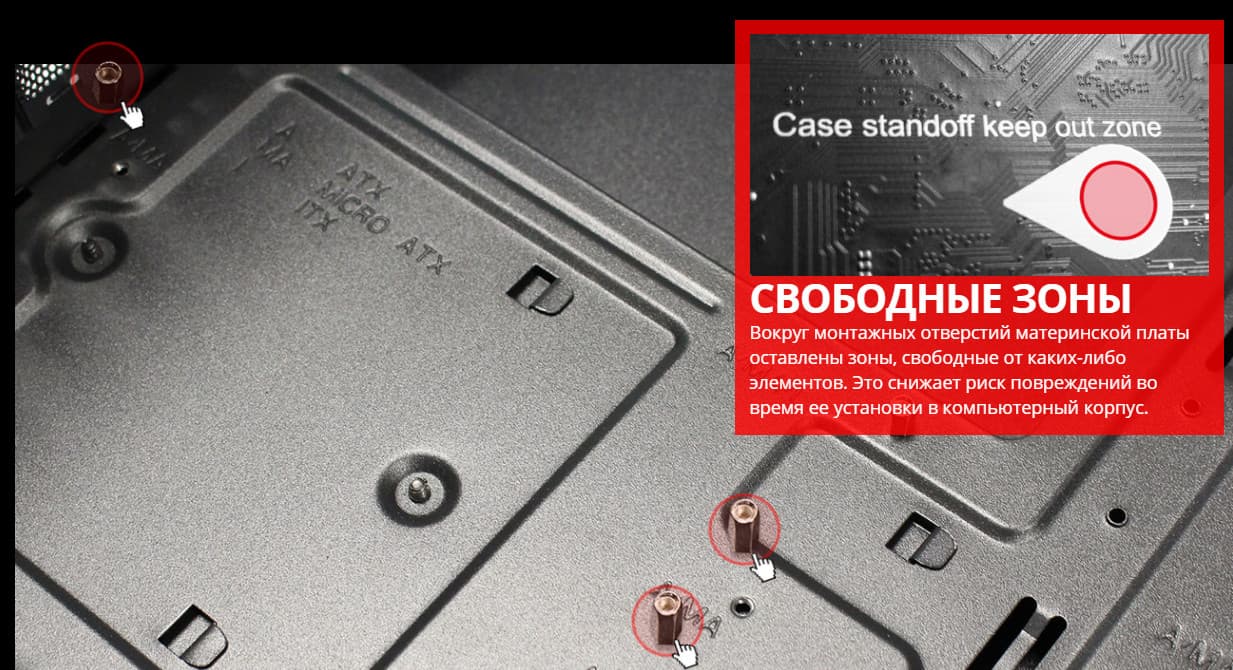 По традиции у всех плат от MSI на оборотной стороне обозначены места, где могут оставаться ненужные в данный момент крепежные втулки (чаще всего латунные), на которые обычно ложится матплата в корпусе, и к которым ее прикручивают. Эти места отмечены белой краской, и нарочно в них нет никаких электропроводных элементов, чтобы в случае установки матплаты не было случайных замыканий или повреждений от лишней крепежной втулки.