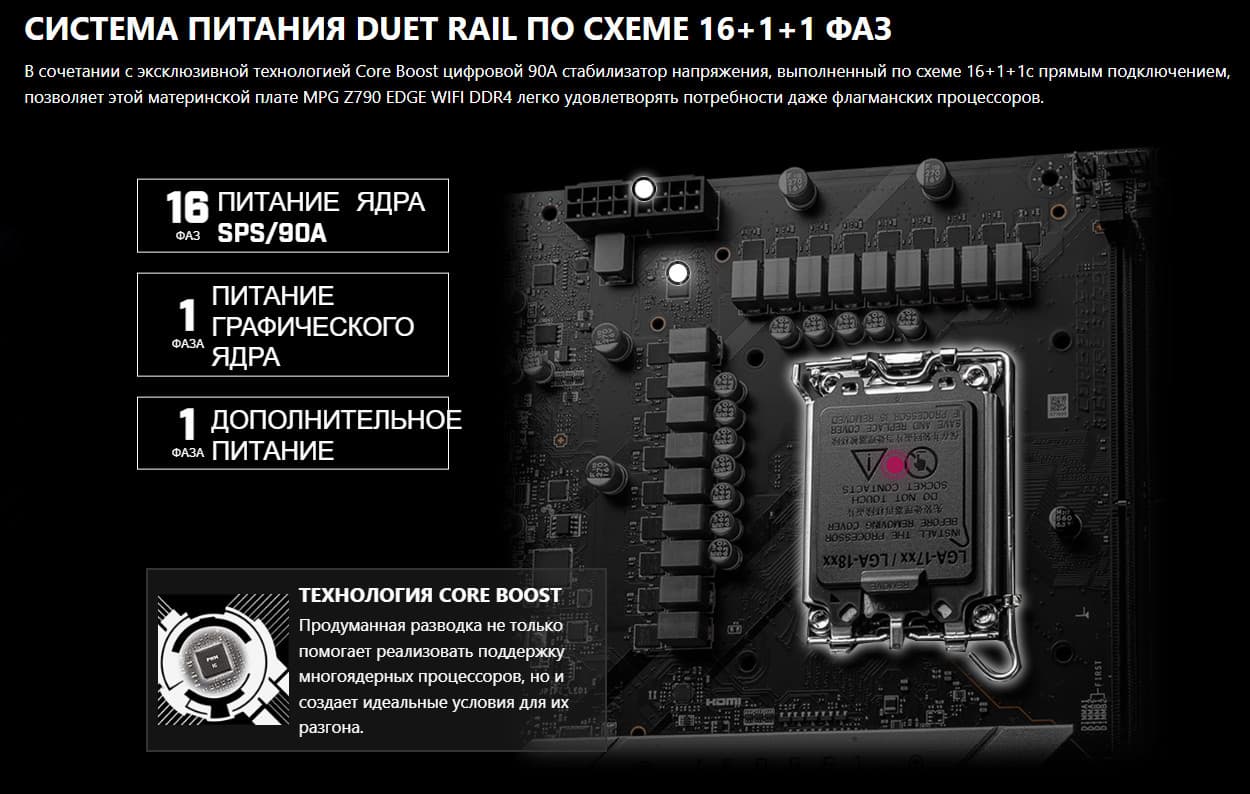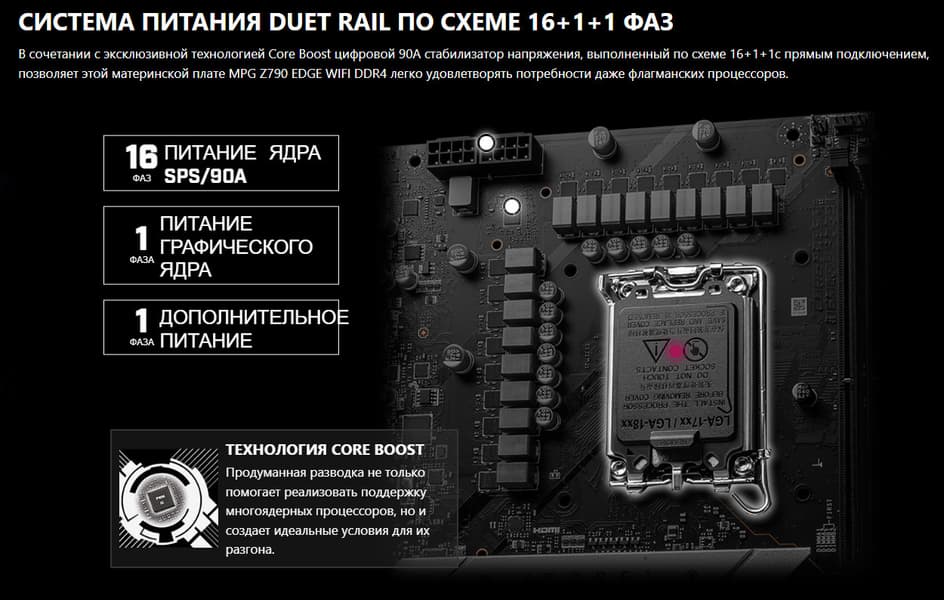 MSI MPG Z790 Edge WiFi DDR4 поддерживает процессоры Intel Core 12/13-го поколений, выполненные под разъем (сокет) LGA1700.