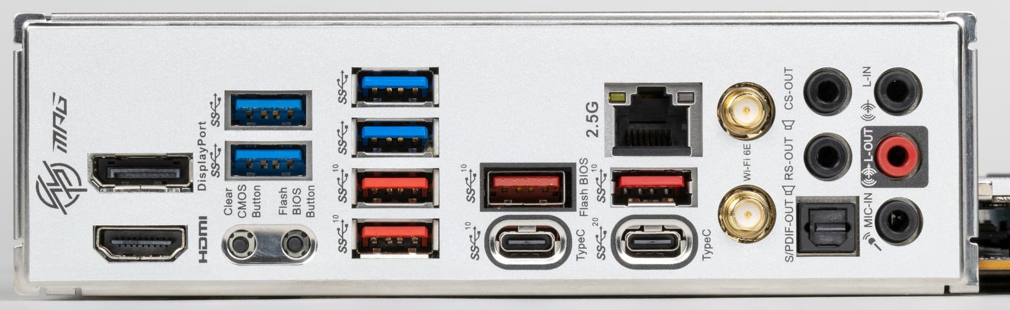 | Разъемы на задней панели | 1 × USB 3.2 Gen2x2 (Type-C) 1 × USB 3.2 Gen2 (Type-C) 4 × USB 3.2 Gen2 (Type-A) 4 × USB 3.2 Gen1 (Type-A) 1 × RJ-45 5 аудиоразъемов типа миниджек 1 разъем S/PDIF 2 антенных разъема 1 разъем HDMI out 1 разъем Display Port out кнопка сброса CMOS кнопка перепрошивки BIOS — Flash BIOS |