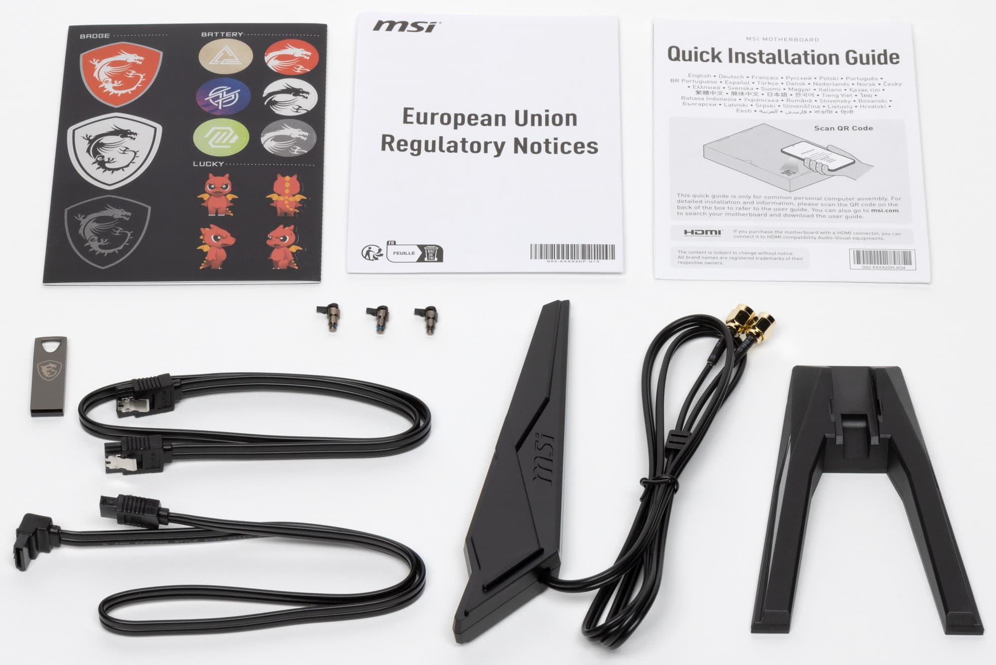 Комплект поставки весьма прост: кроме традиционных элементов типа руководства пользователя и кабелей SATA, имеются USB-накопитель с ПО, антенны встроенного Wi-Fi-модуля, дополнительные крепежи для М.2 слотов, бонусные стикеры.