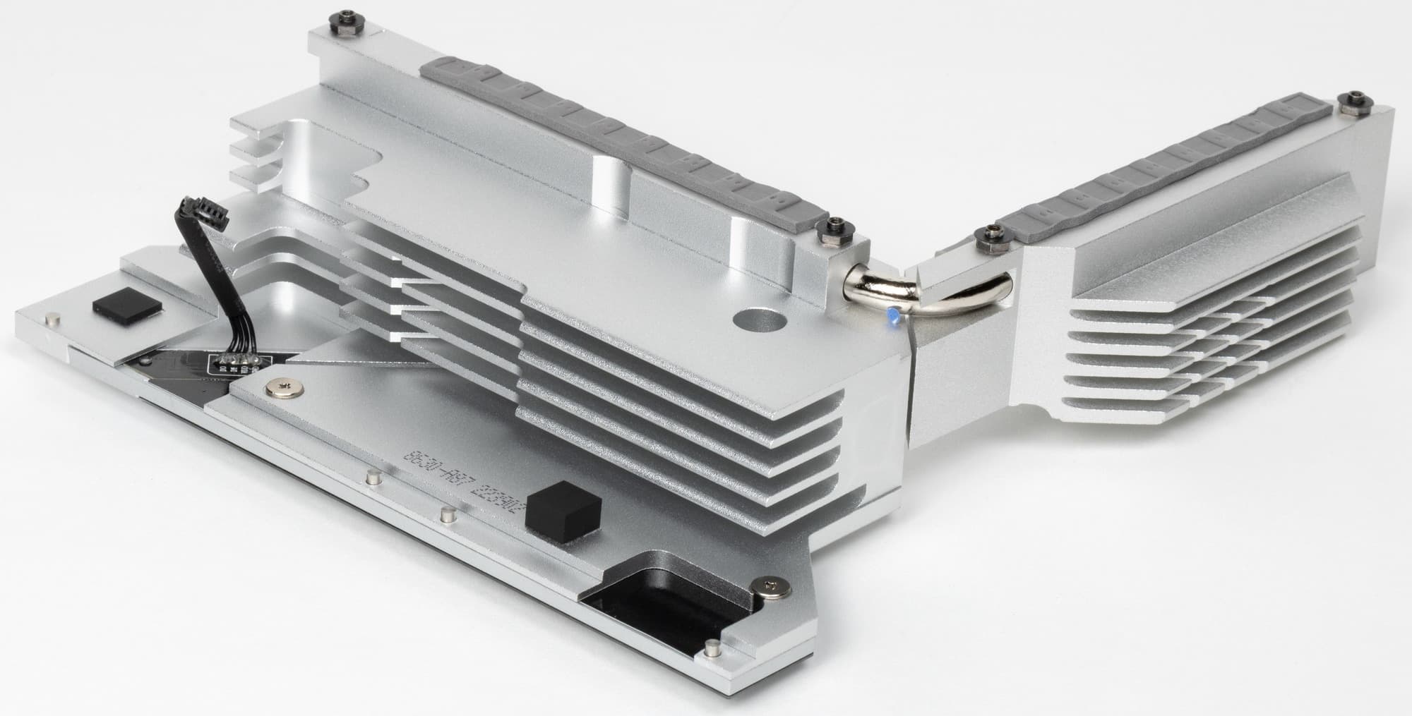 Как мы видим, охлаждение чипсета (один радиатор) организовано отдельно от силовых преобразователей. VRM-секция имеет свои два радиатора, соединенные тепловой трубкой под прямым углом.