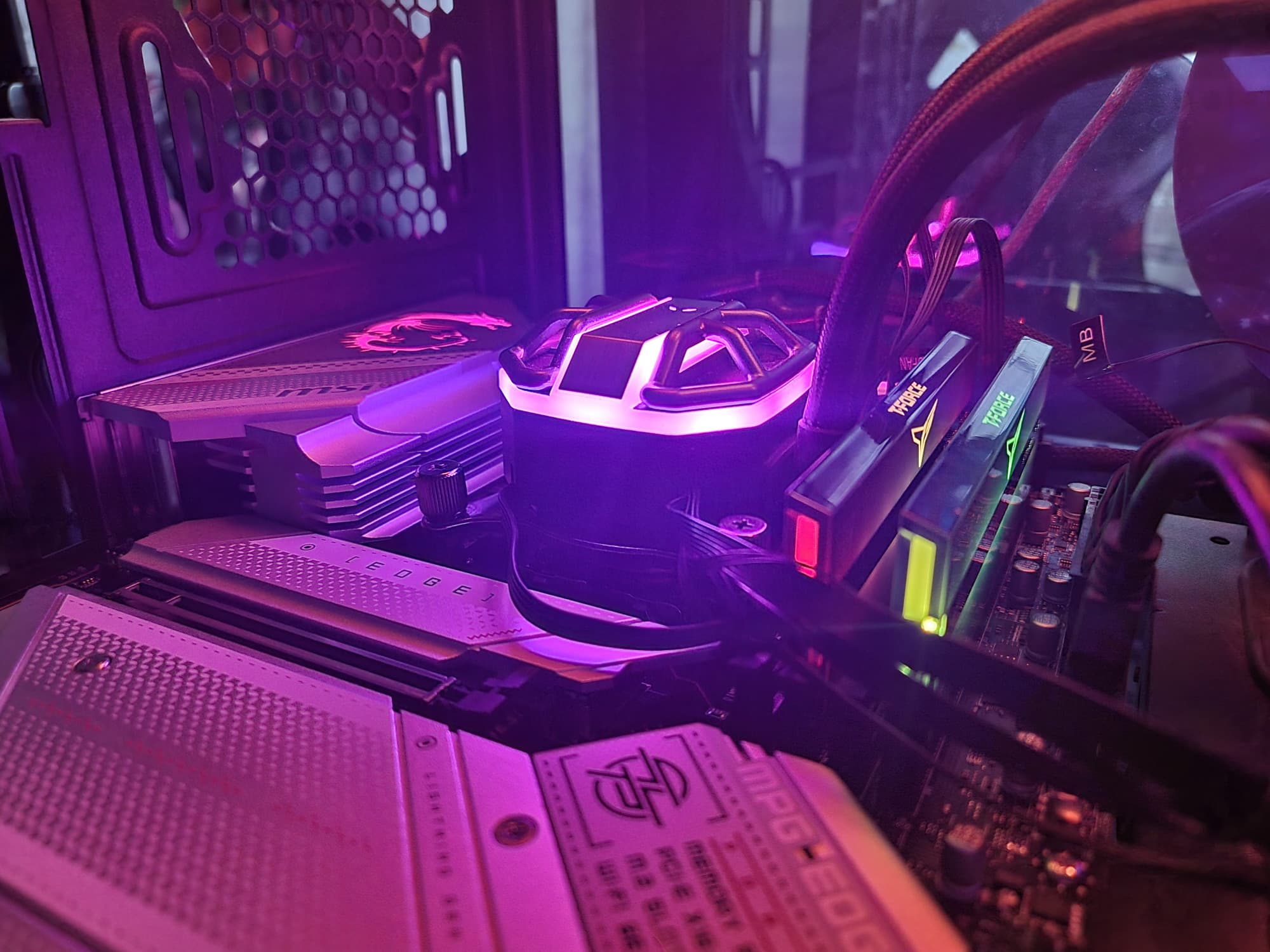 Еще у этой модели 7 портов SATA и 8 разъемов для вентиляторов. Плата относится к серии MPG, одной из флагманских, так что система питания процессора у нее очень мощная, она способна обеспечить работу любых совместимых процессоров с приличным запасом на разгон (хотя в схеме используются удвоители фаз питания). Также мы видим очень грамотную систему охлаждения каждого потенциально греющегося элемента, включая накопители в слотах M.2. Сетевые возможности хорошие: быстрый проводной контроллер 2,5 Гбит/с, а также один самый современный беспроводной. В числе плюсов платы можно упомянуть широкие возможности для подключения RGB-устройств подсветки, а также дизайн с приятной подсветкой.