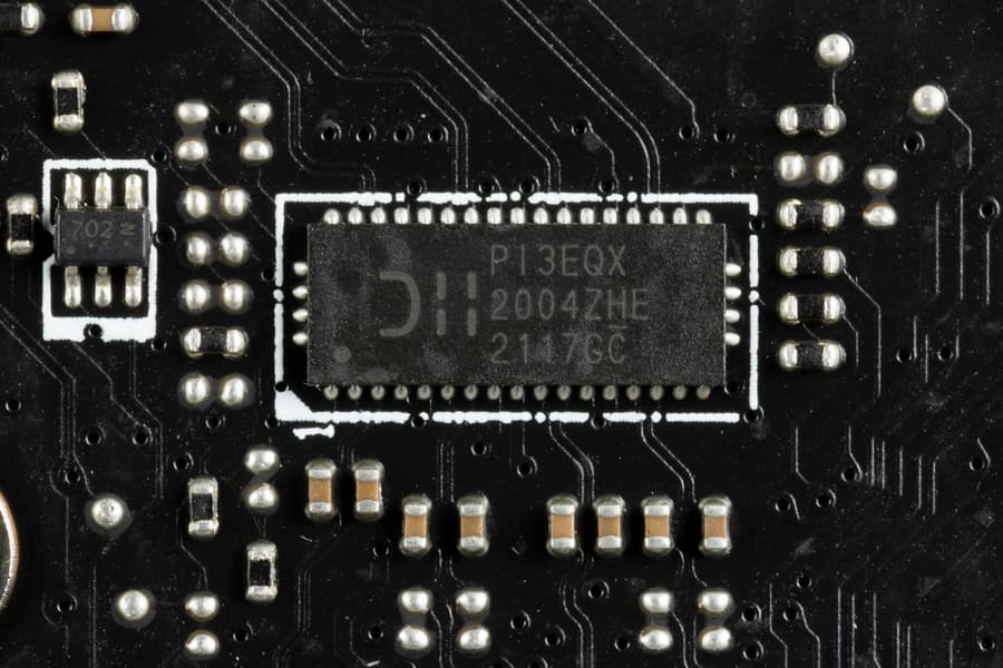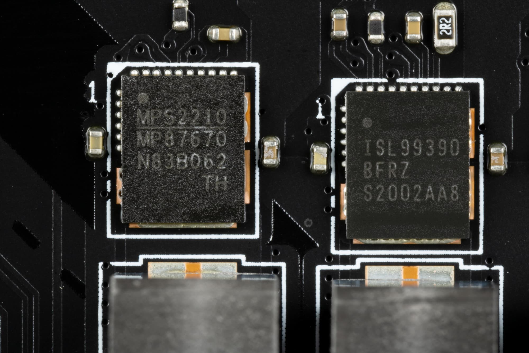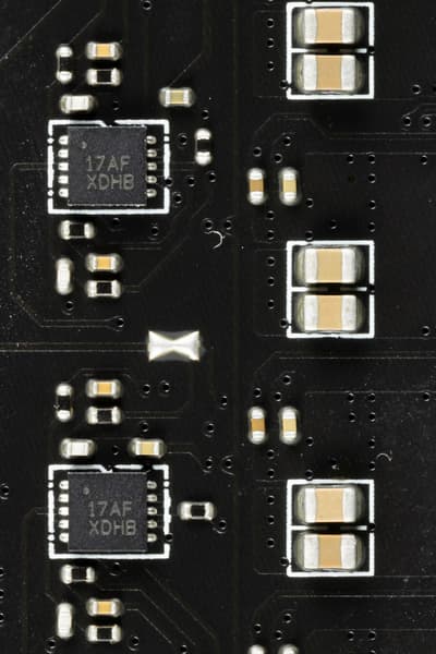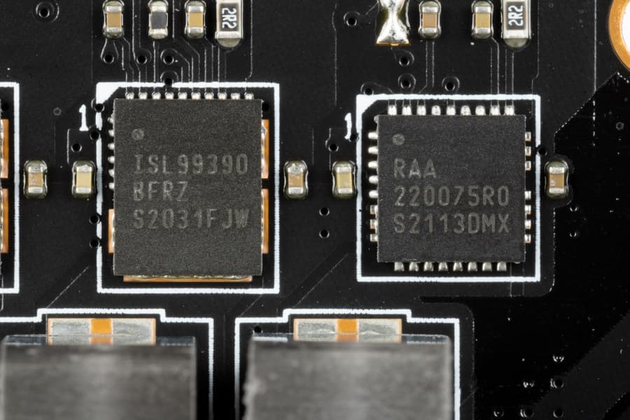 Каждый канал фазы имеет суперферритовый дроссель и RAA 220075RO MOSFET от Renesas на 75 А для встроенного графического ядра, ISL99390 (90A, Renesas) для VCore и MP87670 от Monolithic Power Systems для VCCIO на 70А.