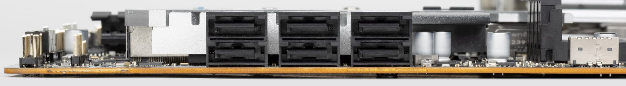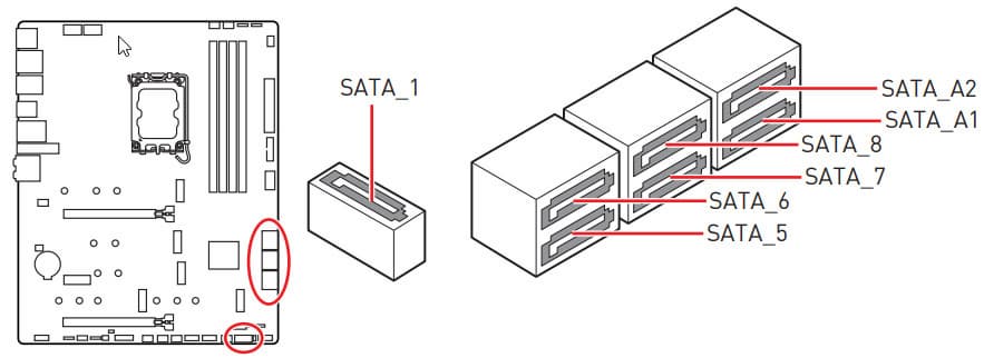 Всего у платы 7 разъемов Serial ATA 6 Гбит/с + 5 слотов для накопителей в форм-факторе M.2. Порты SATA странно промаркированы: 1, 5, 6, 7, 8, A1, A2. 5 из них реализованы через чипсет Z790 и поддерживают создание RAID. При этом порт SATA 1 делит ресурсы с портом М.2_3.