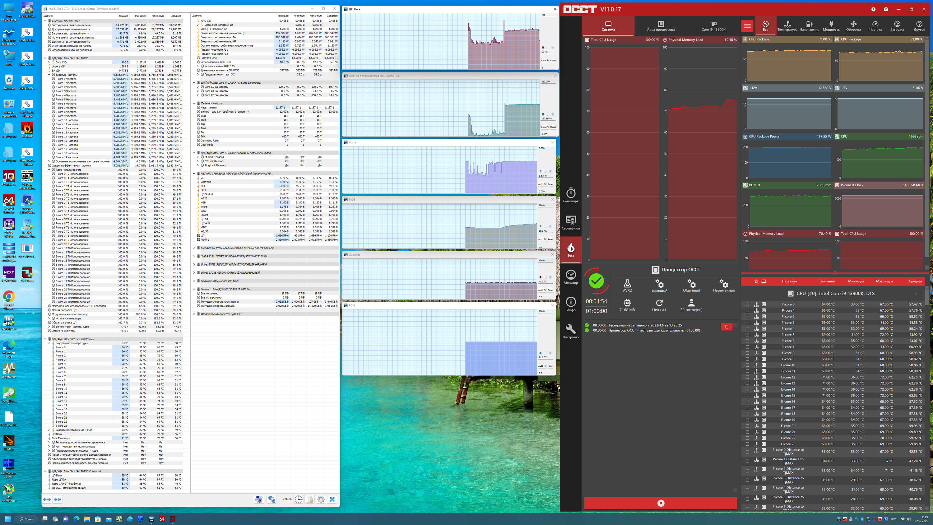 Ну что же, весьма неплохо! В режиме авторазгона мы получили 5.5 ГГц по всем P-ядрам, и 4.3 ГГц по всем Е-ядрам! Напомню, что Р-ядра — это обычные всем привычные ядра, имеющие по 2 потока каждый, «Р» — означает Performance, то есть производительные. «Е» — это энергоэффективные ядра, так называемые, малые ядра, у них по 1 потоку. В целом мы видим, что система по умолчанию, определив мощное питание матплаты, выставила очень приличный авторазгон. Все остальные параметры системы по нагреву компонентов были в норме. И стоит отметить, что потребление CPU уже приблизилось к 200 Вт.