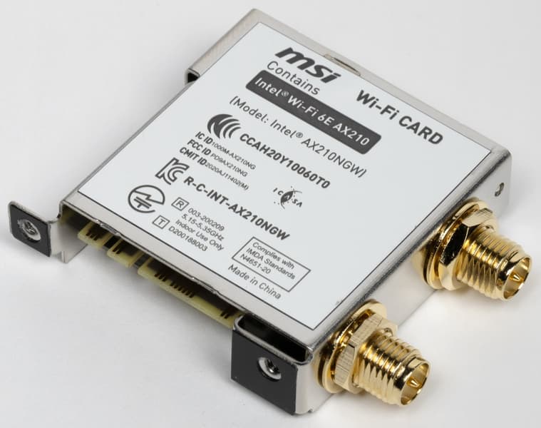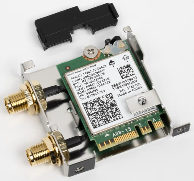 Имеется и комплексный беспроводной адаптер на контроллере Intel AX-210NGW, через который реализованы Wi-Fi 6E (802.11a/b/g/n/ac/ax) и Bluetooth 5.2. Он установлен в слот M.2 (E-key), и его разъемы для привинчивания выносных антенн выведены на заднюю панель.