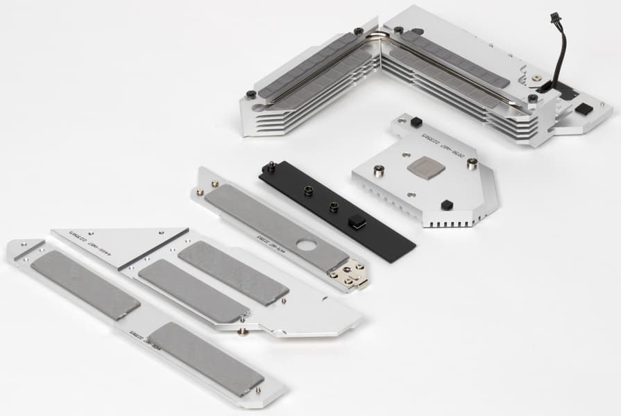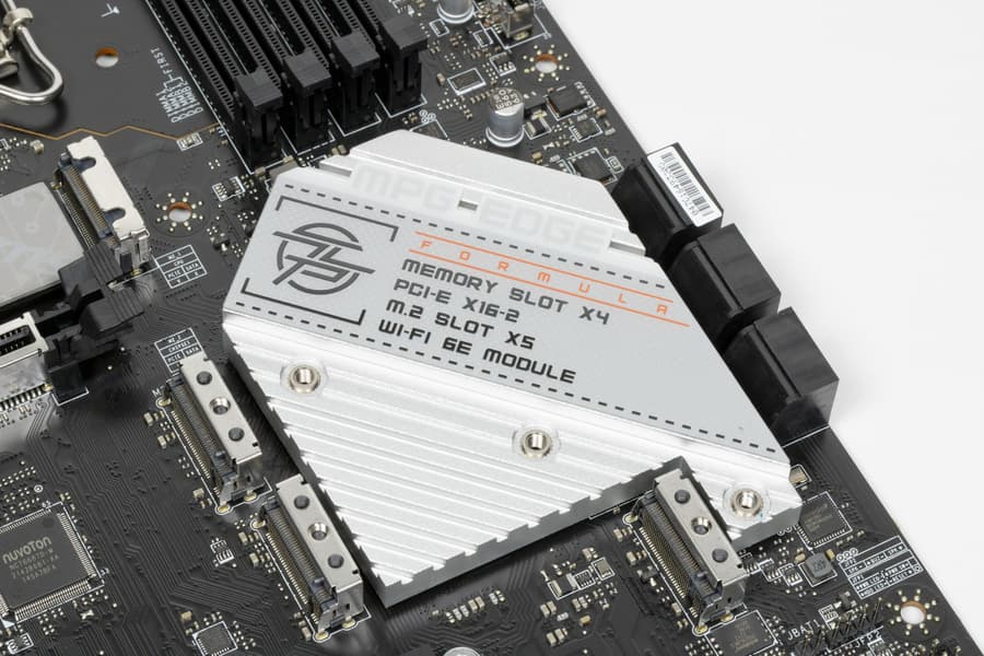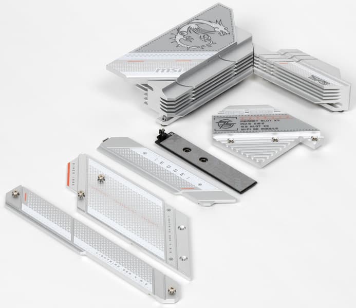 Все M.2 слоты имеют радиаторы. Верхний M.2_1 обладает отдельным радиатором, когда как остальные слоты M.2 имеют общие радиаторы (у М.2_2 и M.2_5 общий радиатор с чипсетом).