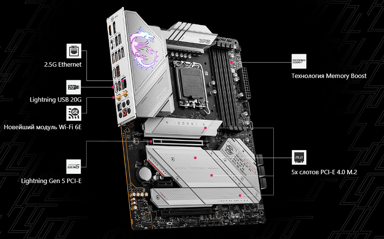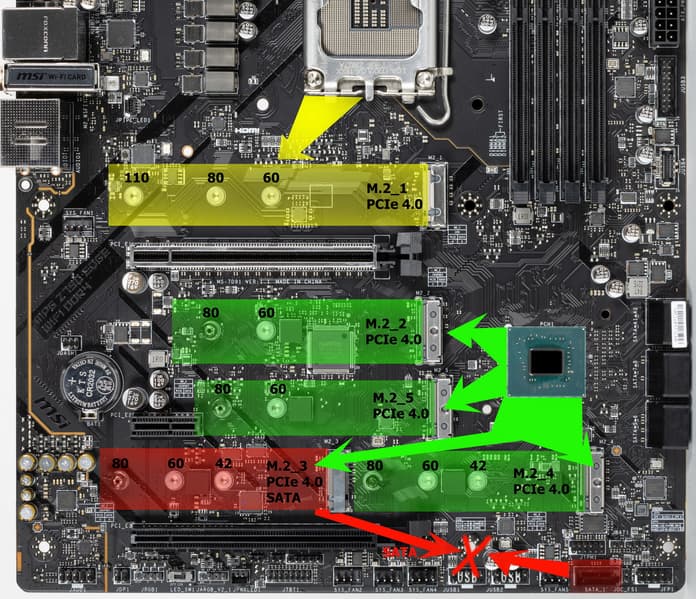 Второй, третий, четвертый и пятый слоты M.2 получают данные от чипсета Z790, при этом все они поддерживают PCIe 4.0. Первый M.2_1 получает данные от CPU (PCIe 4.0). При этом М.2_3 поддерживает модули с любым интерфейсом, а все остальные работают с модулями только с PCIe интерфейсом.