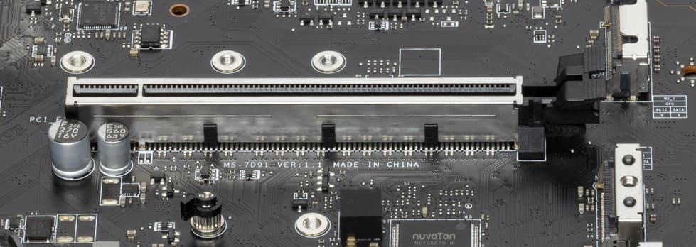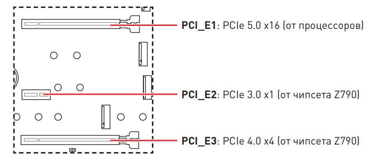 Всего на плате есть 3 слота: слот PCIe x16_1 (PCI_E1) (для видеокарт или других устройств), слот PCIe x16_2 (PCI_E3, фактически имеющий 4 линии) и один PCIe_x1 (PCI_E2). Если про первый PCIe x16 я выше уже рассказал (он подключен к CPU), то PCIe x16_2 подключен к Z690 и работает в режиме х4.
