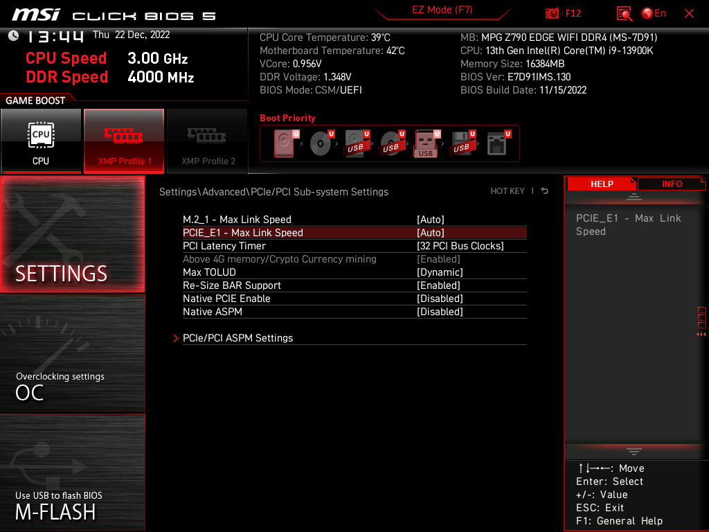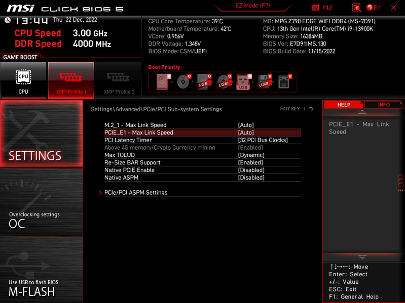 Теперь посмотрим выше на то, как работают процессоры в данной конфигурации. У CPU 12/13-го поколений всего 20 линий PCIe, 4 из них версии PCIe 4.0 отведены на порт М.2 (M2_1). Оставшиеся 16 линий PCIe 5.0 идут на слот PCIe x16_1 (PCIe_E1). Вариантов переключения нет, потому и мультиплексоров для слотов нет.