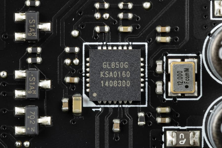 - 4 порта USB 2.0/1.1: все реализованы через контроллер Genesys Logic GL850G (на него потрачена 1 линия USB 2.0) и представлены двумя внутренними разъемами на материнской плате (каждый на 2 порта).