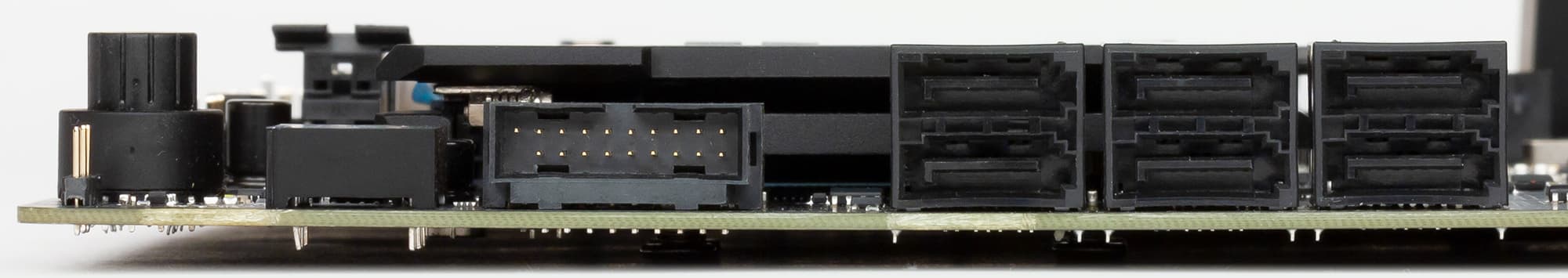 Для подключения накопителей или оптических приводов на плате предусмотрено шесть портов SATA600, реализованных на базе интегрированного в чипсет AMD X470 контроллера. Последний поддерживает до восьми портов, но компания этим не воспользовалась. Более того, как уже было сказано выше, использование SATA-накопителя во втором разъеме M.2 уменьшает количество доступных портов до пяти, а первый разъем M.2 таковые не поддерживает вовсе. Таким образом, общее число SATA-устройств, которые можно подключить к плате, равно шести. На практике этого будет, скорее всего, достаточно, но мы все же предпочли бы не сталкиваться с ограничениями в продукции такого уровня — тем более, что это вполне возможно технически, да и реализовано многими конкурентами («обреза́ть» же поддержку накопителей со стороны SoC не принято даже в более дешевых платах).