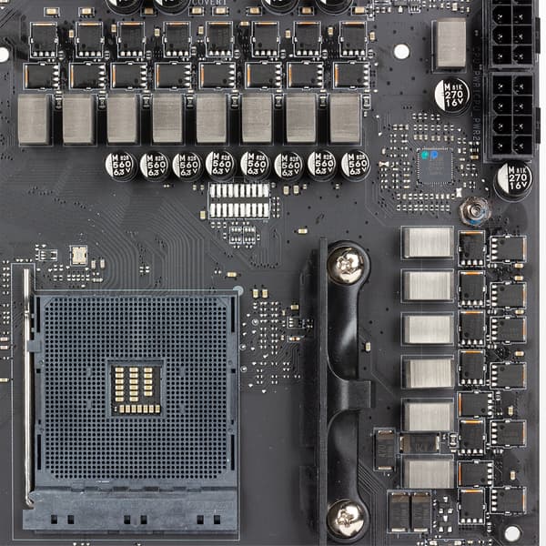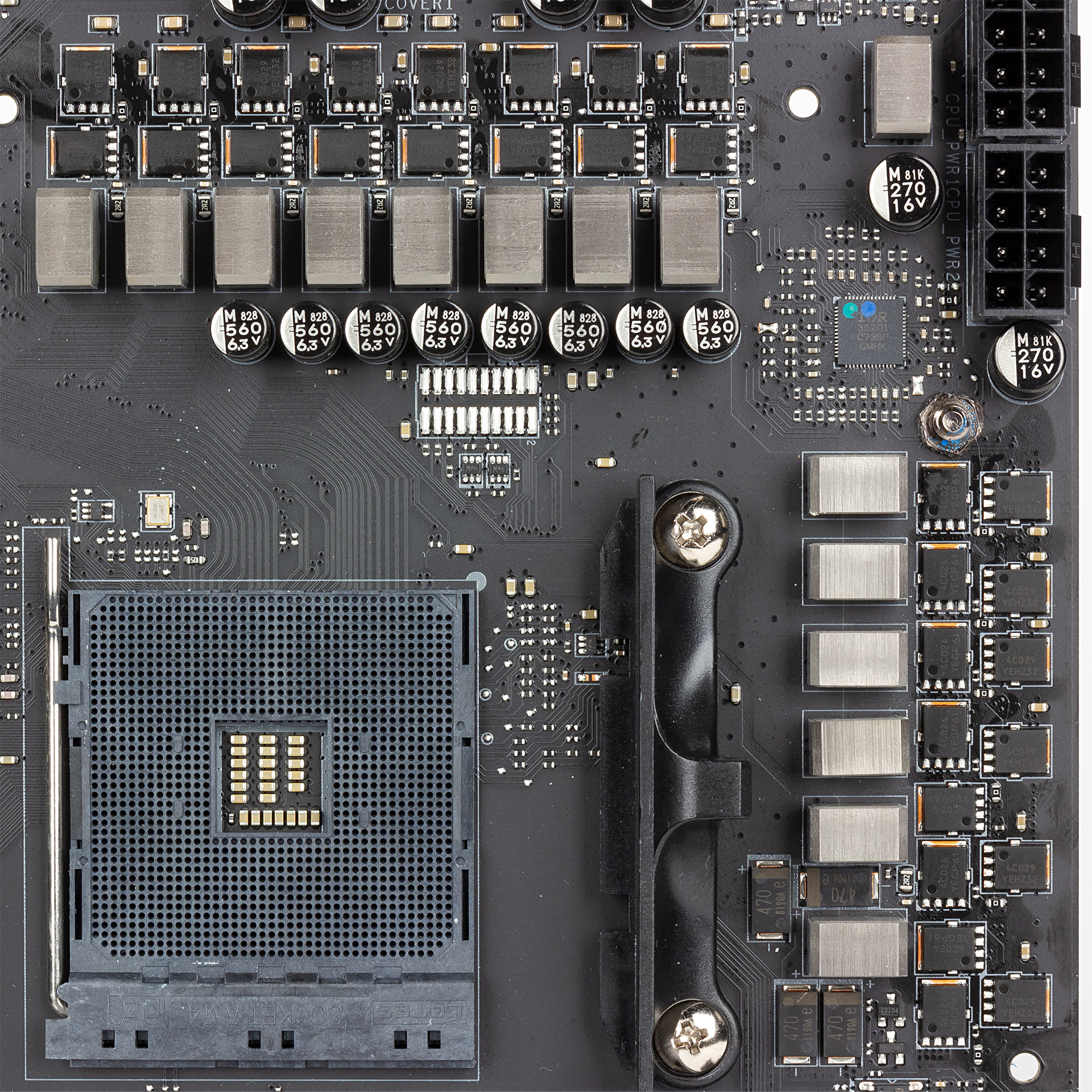 Система питания процессора основана на ШИМ-контроллере International Rectifier IR35201 и включает 14 фаз. Естественно, получается такое их количество при помощи удвоителей IR3598, так что правильнее говорить о схеме питания 6+1, нежели 12+2. В качестве силовых элементов используются мосфеты On Semiconductor NTMFS4C024N и NTMFS4C029N. В принципе, на практике этого вполне достаточно — вот только применение обычных полевиков, а не интегрированных сборок в плате верхнего ценового диапазона выглядит, мягко говоря, странновато.
