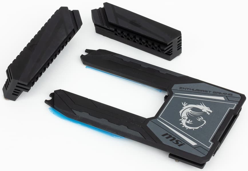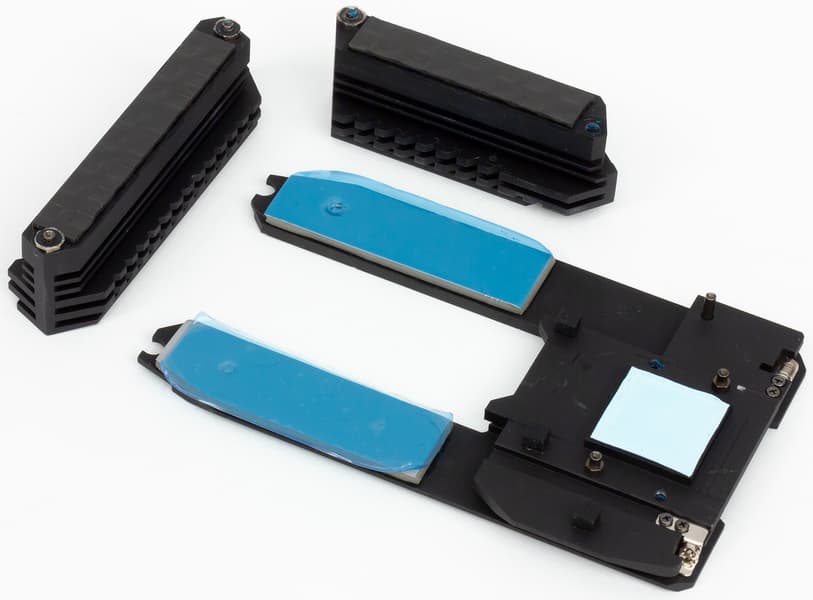 Еще один составной радиатор предназначен для охлаждения чипсета, а также установленных в оба разъема M.2 твердотельных накопителей. Небольшая его часть жестко закреплена на чипсете, а верхняя пластина для охлаждения накопителя сделана откидывающейся и крепится двумя винтиками. Кстати, при использовании SSD формата 2280 (т. е. большинства устройств на рынке) их фиксация осуществляется теми же винтиками, что удобно. Для более коротких карт придется использовать дополнительные стойки и винтики, но охлаждение осуществляется в любом случае.