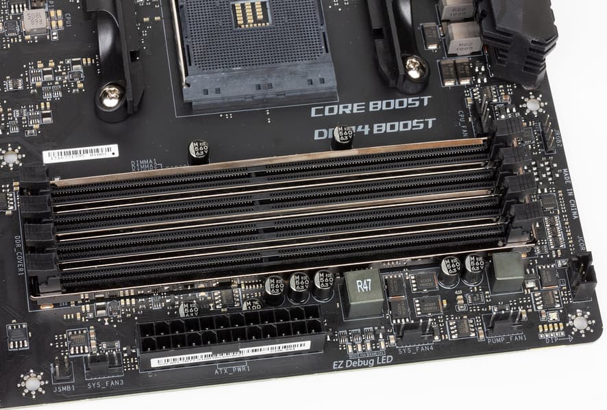 Для установки модулей памяти на плате предусмотрено четыре DIMM-слота. Поддерживается небуферизованная память DDR4 (non-EСС), а максимальный ее объем составляет 64 ГБ (при использовании модулей емкостью по 16 ГБ). Максимальная тактовая частота, согласно спецификации, составляет 3600 МГц (в режиме разгона), однако в BIOS можно выбирать и более высокие — вплоть до 4200 МГц с шагом 66 МГц.