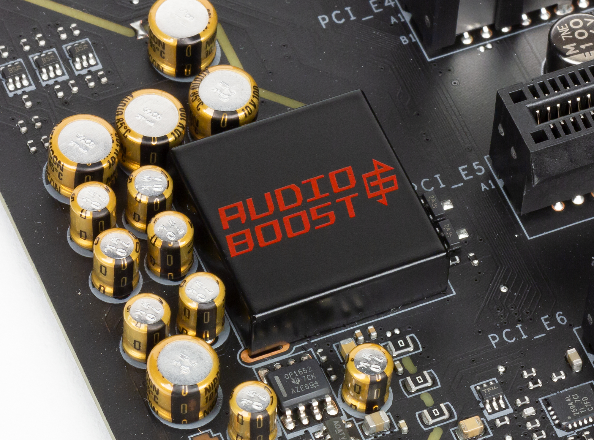 Аудиоподсистема платы (как и всех топовых современных моделей), основана на HDA-аудиокодеке Realtek ALC1220. Все элементы аудиотракта изолированы на уровне слоев PCB от прочих компонентов платы и выделены в отдельную зону. Помимо аудиокодека звуковая подсистема платы включает фильтрующие конденсаторы Nichicon, а также операционный усилитель OPA O1652.