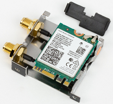 Третий разъем M.2 (E-Key) предназначен для установки модуля Wi-Fi + Bluetooth, который входит в комплект поставки. Традиционно для современных плат, выполнен он вертикально и использует один чипсетный порт PCIe 2.0 и один порт USB 2.0.