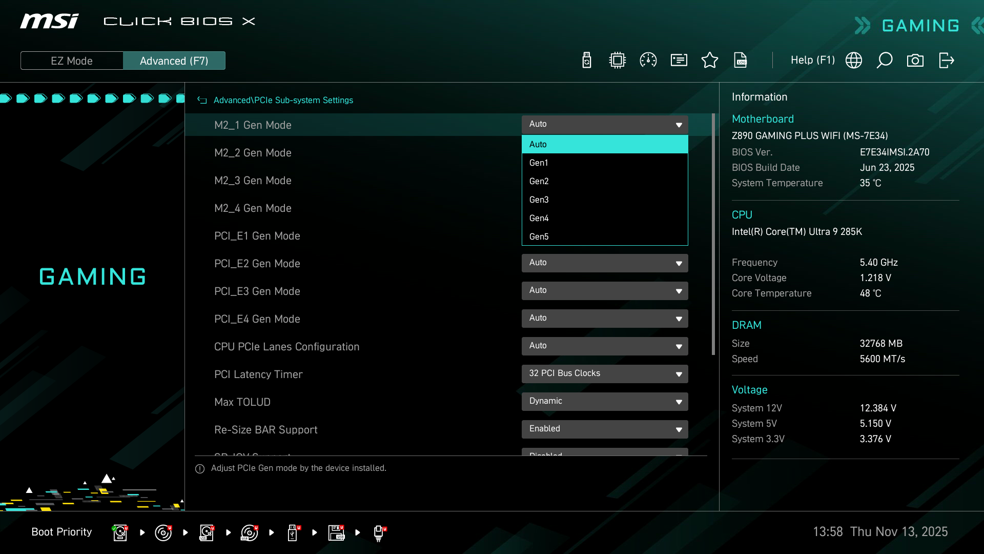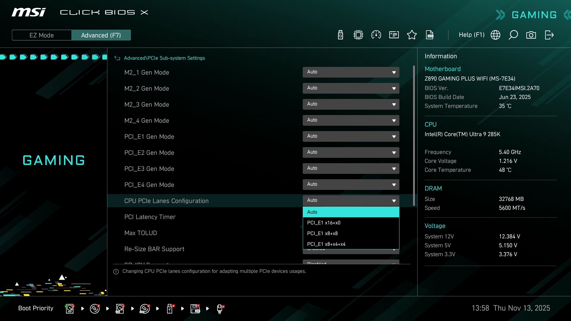 Теперь посмотрим выше на то, как работают процессоры в данной конфигурации. У CPU Core Ultra 2xx всего 24 линии PCIe, из них 4 линии версии PCIe 5.0 отведены на порт М.2 (M.2_1), 4 линии версии PCIe 4.0 отведены на порт М.2 (M.2_2) . Оставшиеся 16 линий PCIe 5.0 идут на слот PCIe x16_1 (PCI_E1). Так что вариантов переключения линий PCIe 5.0 между слотами нет (имеется только возможность на первом слоте задать конфигурацию 16 линий: x16, x8+x8, x8+x4+x4, это на случай установки в данный слот карты расширения с портами M.2).