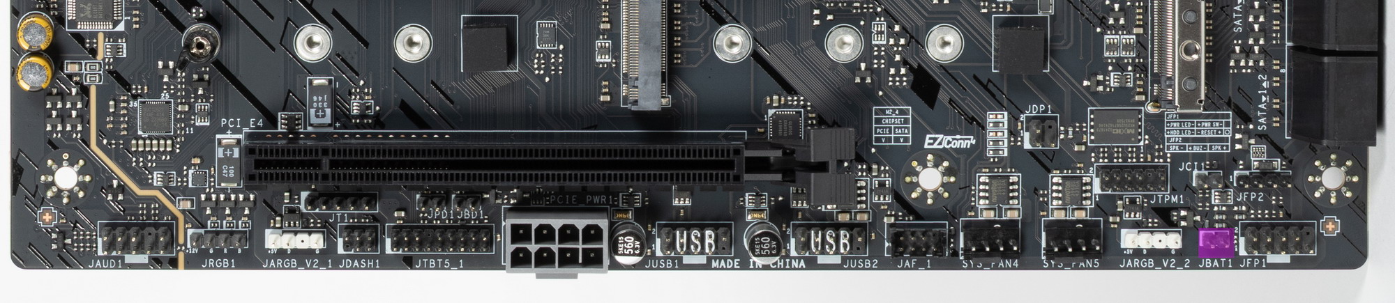 Всего на плате есть 4 слота: слот PCIe x16 (PCI_E1 для видеокарт или других устройств), два «длинных» PCIe x16 слота (PCI_E3/E4, но фактически имеющих по 4 линии PCIe 4.0) и один PCIe x1 (PCI_E2).