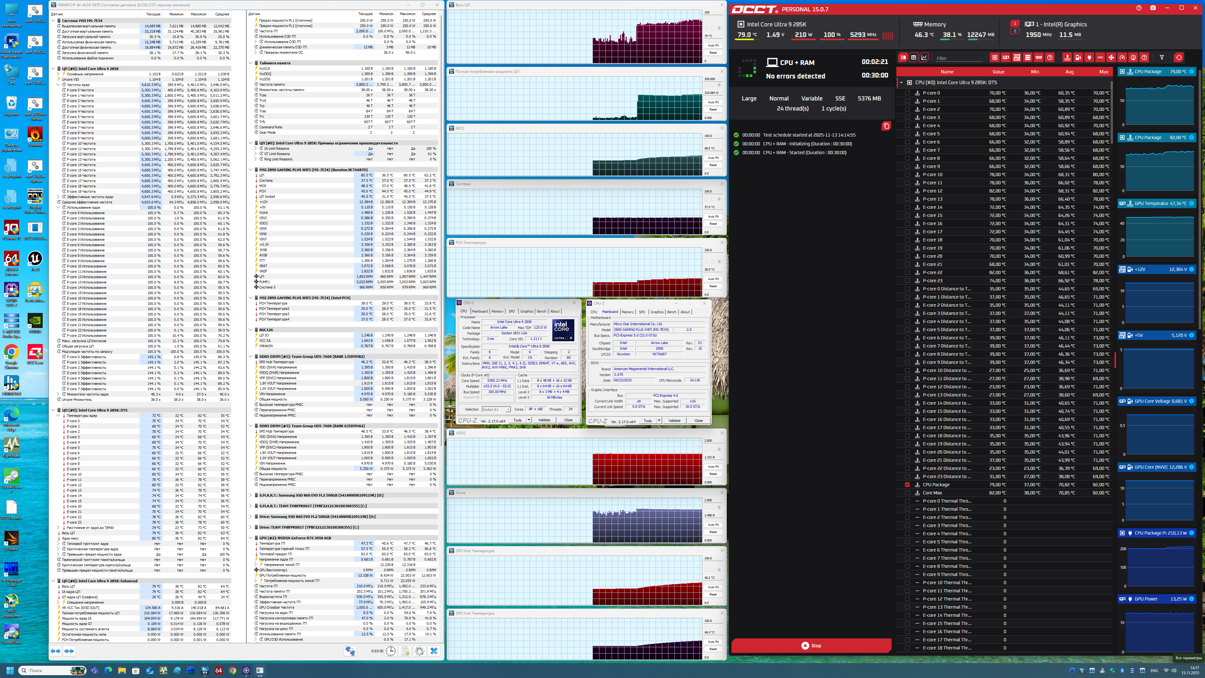 В режиме авторазгона мы получили до 5,3 ГГц по P-ядрам, и 4.6 ГГц по всем Е-ядрам. Напомню, что начиная с этого поколения процессоров, все ядра имеют по 1 потоку, то есть гипертрейдинга (многопоточности) теперь нет. Потребление процессора достигало 200 Вт.