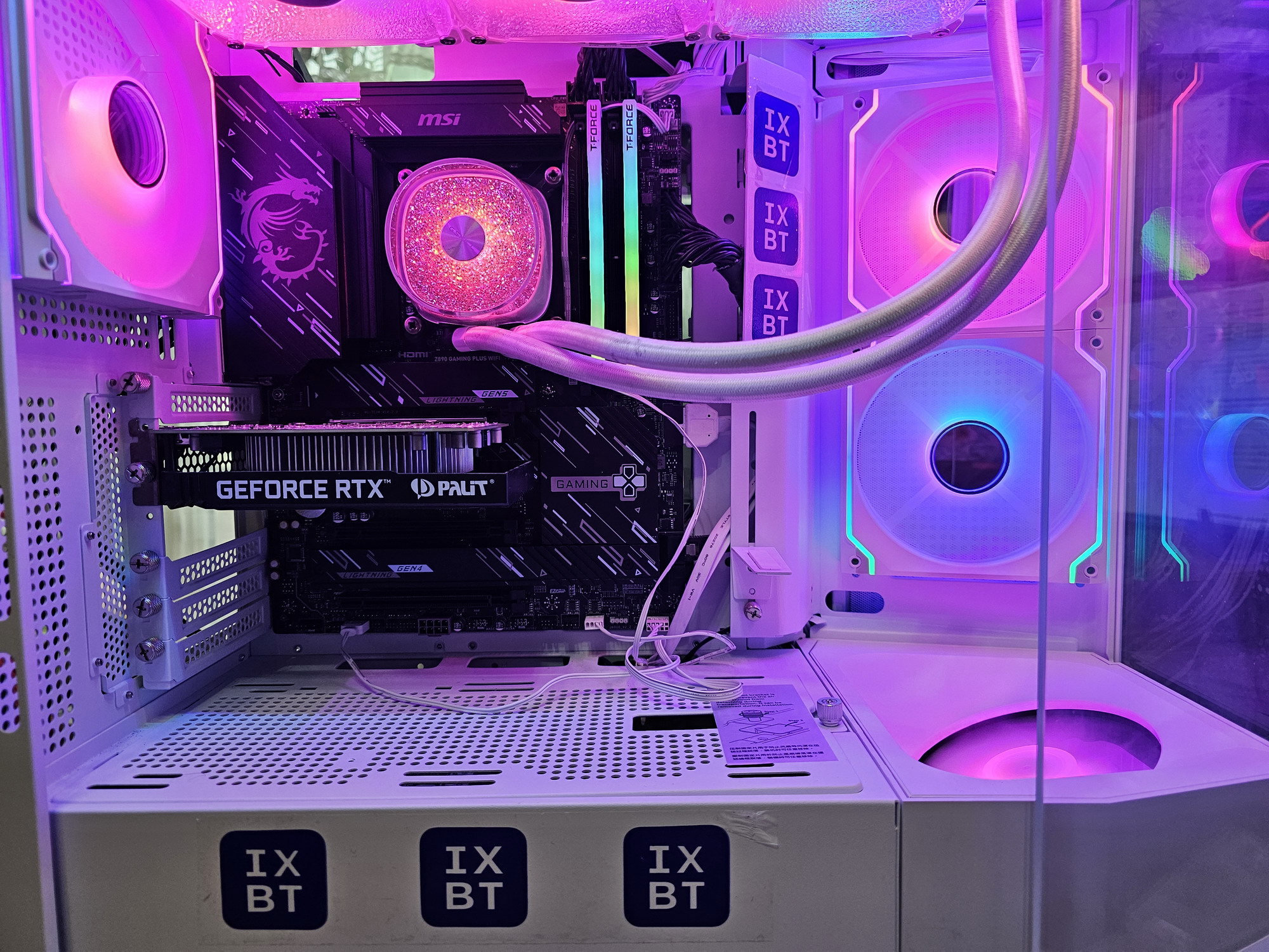 В арсенале платы также есть 4 порта SATA и 7 разъемов для вентиляторов. Система питания процессора относительно мощная, способная обеспечить работу любых совместимых процессоров с приличным и уже традиционным запасом на разгон. Плата имеет грамотную систему охлаждения каждого потенциально греющегося элемента, включая накопители в слотах M.2. Сетевые возможности включают скоростной проводной контроллер 5 Гбит/с и один самый современный беспроводной — Wi-Fi 7 + Bluetooth 5.4. В числе плюсов платы можно упомянуть широкие возможности для подключения дополнительных RGB-устройств.