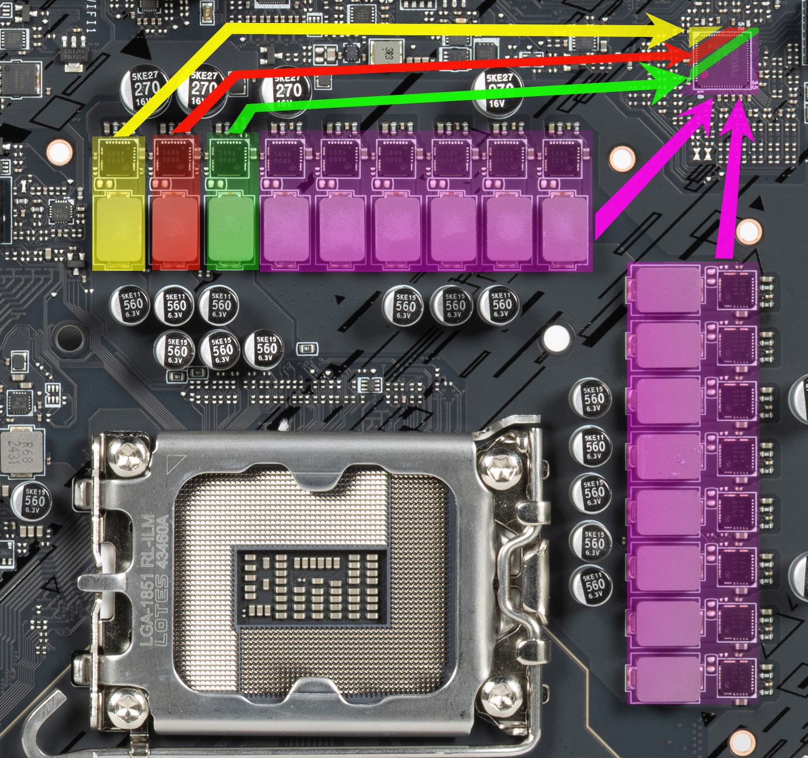 Схема питания процессора выполнена по схеме 14+1+1+1 (всего 17 фаз: 14 на VCore (ядро процессора), 1 на iGPU (интегрированное графическое ядро), 1 на VCCSA (System Agent, кольцевая шина) и 1 на VNNAON (управление энергосбережением).