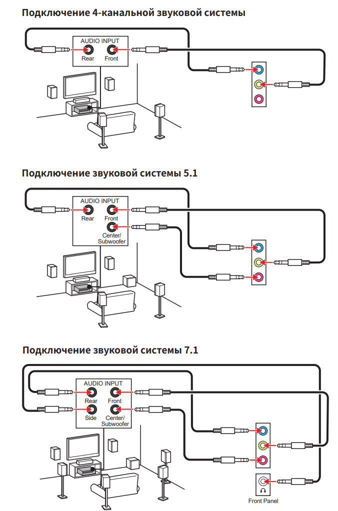 Вывод по схеме 7.1 возможен только через использование аудиогнезда на передней панели корпуса совместно с тремя гнездами на самой плате. Настройка схем — с помощью ПО, скачиваемого с сайта производителя.