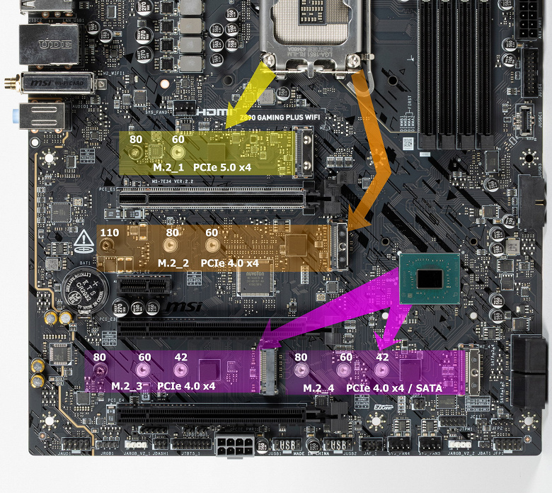 Третий и четвертый слоты M.2 (M.2_3, M.2_4) получают данные от чипсета Z890, а первые два — от CPU, при этом M.2_1 получает PCIe 5.0, а M.2_2 получает от процессора PCIe 4.0.