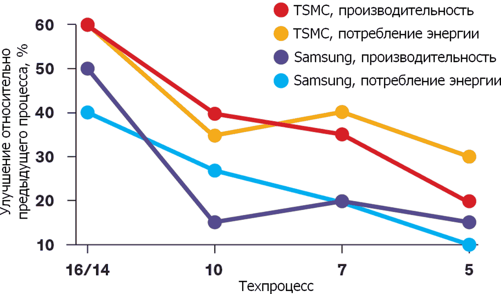 Другая проблема, возникающая в этой связи — стоимость каждого транзистора. Все предыдущие 60 лет развития микроэлектроники основывались на уверенности в том, что даже несмотря на постоянное увеличение цены заводов и разработки техпроцессов и чипов цена самих чипов в пересчете на транзистор будет все время уменьшаться. Так и происходило — примерно до 32 нм, после которых наступил раскол: микросхемы памяти продолжили дешеветь на единицу объема (особенно это коснулось флэш-памяти, которая массово перешла на объемное хранение данных на десятках уровней — технология 3D-NAND), а вот логика сильно затормозилась. Да, последние версии техпроцессов 14 нм предлагают транзисторы все же чуть дешевле, чем у 22 нм — но именно что «чуть», и это после стольких лет возни. Да и производительность при том же потреблении энергии хоть и растет, но всё медленнее…