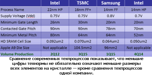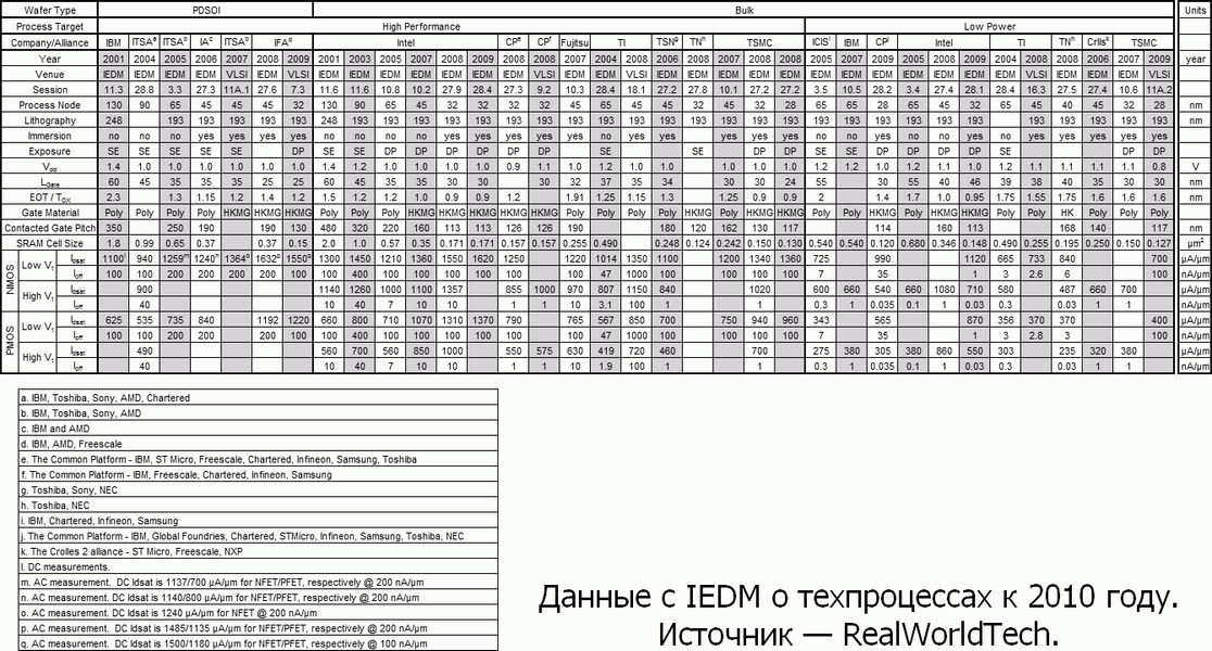 В этой таблице указана площадь (в квадратных микронах) шеститранзисторной ячейки статической памяти (СОЗУ — из нее, например, состоят почти все виды кэшей процессоров), которой обычно меряют плотность размещения транзисторов для логических микросхем. Это само по себе любопытно, учитывая, что СОЗУ используются в разнообразных регистрах, буферах и кэшах (то есть одно-, а чаще даже двухмерно регулярных схемах), а не в синтезированной логике, почти не имеющей повторений. И тем не менее, именно это мерило долгие годы было главным показателем фактической крутизны возможностей микроэлектронного фаба. Но главное, что все приведенные в таблице техпроцессы — 45-нанометровые (как утверждают эти компании)!