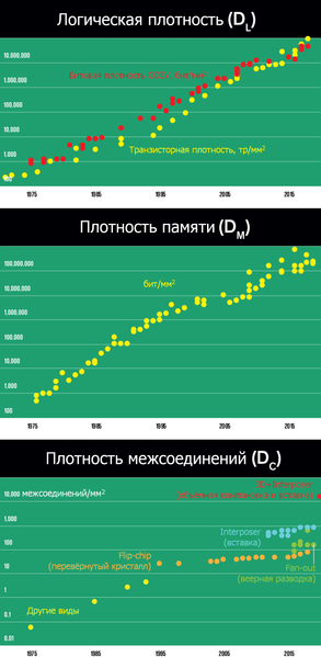 Год назад, видя такие дела, в университете Беркли (Калифорния, США) собрались видные теоретики микроэлектроники (в том числе все три изобретателя «финфетов»: Chenming Hu, Tsu-Jae King Liu и Jeffrey Bokor) и… Да-да, нетрудно догадаться: они предложили новую, очереднадцатую метрику. Назад к нанометрам возвращаться никто не призывает. Наоборот, профессоры и инженеры решили вместо одной цифры использовать три, к плотности транзисторов логики (DL) добавив плотность транзисторов памяти (DM — в битах/мм²; и это не старая-добрая СОЗУ, а еще более плотная динамическая память — ДОЗУ, или DRAM) и плотность связующих кристалл с подложкой шариковых выводов (DC — в тысячах на мм²). Последний параметр знаменует наибольшее отклонение от стандартных мерил техпроцессов, так как не имеет никакого отношения к транзисторам. Тем не менее, в последние годы стало ясно, что подвод питания и обеспечение всё большей пропускной способности и меньших задержек при доступе к памяти требуют от чиподелов показывать заметный прогресс и в этой величине.