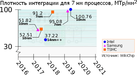 Вместо этого Intel предложила определять возможности техпроцесса по новой формуле, в которую входят площади типовых блоков — простейшего вентиля 2-NAND (двухвходовый логический элемент «и-не») и более сложного синхронного триггера — и число транзисторов в них; их отношения умножены на «правильные» коэффициенты, отражающие относительную распространенность простых (0,6) и сложных (0,4) элементов. Сразу можно заподозрить, что все цифры подобраны для еще более наглядной демонстрации лидерства Intel в сравнении с «другими производителями». Но чуть позже всё стало выглядеть так, будто компания движется вспять, очередной оптимизацией техпроцесса добиваясь худшей плотности: исходный 14-нанометровый процесс (вышедший аж в 2014 г.) имел 44,67 МТр/мм², а дважды обновленный «14++ нм» (образца 2017 г.) — 37,22 МТр/мм². На самом деле это размен с потреблением энергии, которое в «двухплюсовой» версии процесса уполовинилось (опять же — со слов Intel).