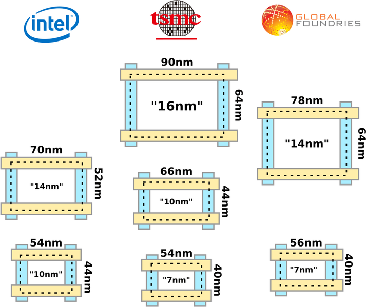 Ситуация второй половины 2010-х годов получилась весьма похожей на то, что переживали в кризис производители продуктов питания: чтобы не увеличивать цены на привычные товары, их просто стали недоливать и недосыпать. Нет-нет, в каждом килобайте кэша все еще ровно 1024 байта, а не 970 (как написано число миллилитров на некоторых «литровых» бутылках молока). Но чиподелы просто окончательно отвязали свои рекламируемые нанометры от физических размеров чего-либо в изготавливаемых микросхемах. TSMC, например, выдала техпроцесс «16FF» с такими же шагами, как у предыдущего на 20 нм. А Intel пошла еще дальше и вспомнила принцип «не можешь отменить — возглавь»: в 2017 г. в ходе ежегодного мероприятия «Производственный день» (Manufacturing Day) старший заслуженный исследователь и директор по архитектурам техпроцессов и интеграции Intel Марк Бор (Mark Bohr) предложил коллегам по отрасли «внести ясность» в определение технологической нормы, изменив его так, чтобы растолковать потребителям, что именно в покупаемых ими микросхемах все-таки улучшается.