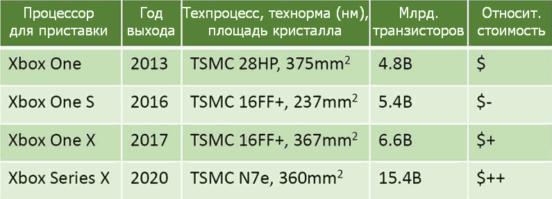 Свежайший пример нелинейного улучшения плотности — параметры процессоров (точнее — SoC, однокристальных систем) для игровых приставок Microsoft серии XBox. Все эти чипы проектировались силами AMD, а производятся у TSMC, поэтому сравнивать их параметры весьма удобно. При почти неизменной площади 360–375 мм² переход от 28 нм к 16 увеличил плотность не втрое (как можно было ожидать при линейном уменьшении размеров транзисторов), а всего на треть (сравнивая XBox One и XBox One X). А следующий переход к 7 нм должен был дать аж 5-кратное уплотнение, но выдал только 2,3 раза. Цена процессора при этом не забывала расти.