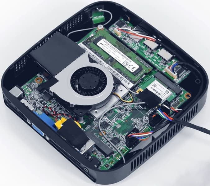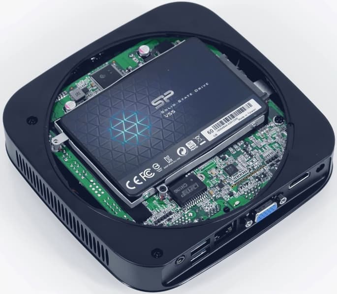 Функциональность неттопа определяет использование процессора Intel Celeron J3160. Этот процессор основан на «атомной» архитектуре, имеет 4 ядра с частотой 1,6 ГГц (с повышением до 2,24 ГГц) и TDP 6 Вт. Используется и интегрированное графическое ядро Intel HD Graphics 400 этого процессора, дискретной графики в неттопе нет. В системе установлен один модуль памяти DDR3L на 4 ГБ и стандартный 2,5-дюймовый SSD на 60 ГБ. Объем памяти и SSD в других модификациях модели могут быть изменены, также вместо SSD может устанавливаться ноутбучный HDD. Питается компьютер от небольшого внешнего БП мощностью 36 Вт, этой мощности хватает с запасом, блок питания при работе почти не нагревается.