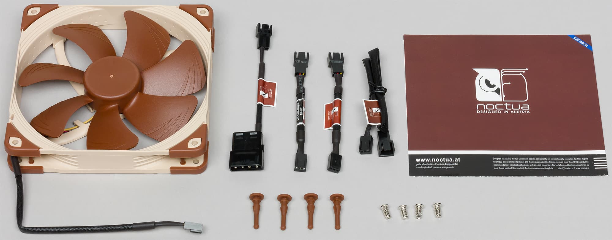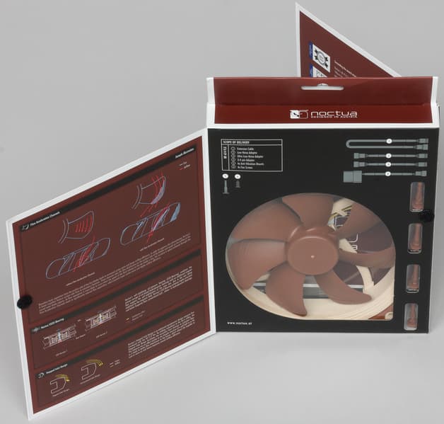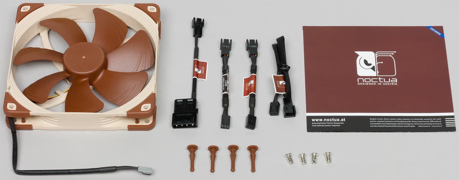 В комплект поставки входит сам вентилятор, адаптер для подключения вентилятора к периферийному разъему БП («Molex»), вставки L.N.A. (Low-Noise Adapter) NA-RC10 и U.L.N.A. (Ultra-Low-Noise Adapter) NA-RC11 для снижения скорости вращения, удлинитель кабеля питания, 4 штуки антивибрационных стоек и 4 штуки обычных винтов. Присутствует и напечатанное руководство на английском языке. На сайте компании есть полное описание вентилятора, там же можно найти ссылки на PDF-файлы с руководством и описанием (варианта на русском языке нет), а также фотографии продукта, видеообзоры, ссылки на текстовые обзоры и на магазины Amazon и eBay, где можно купить продукцию Noctua.