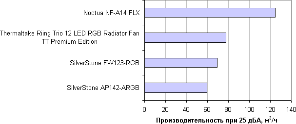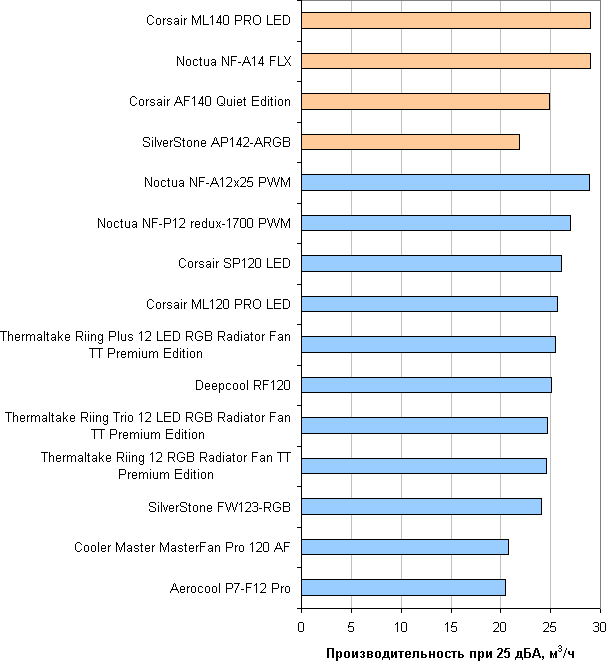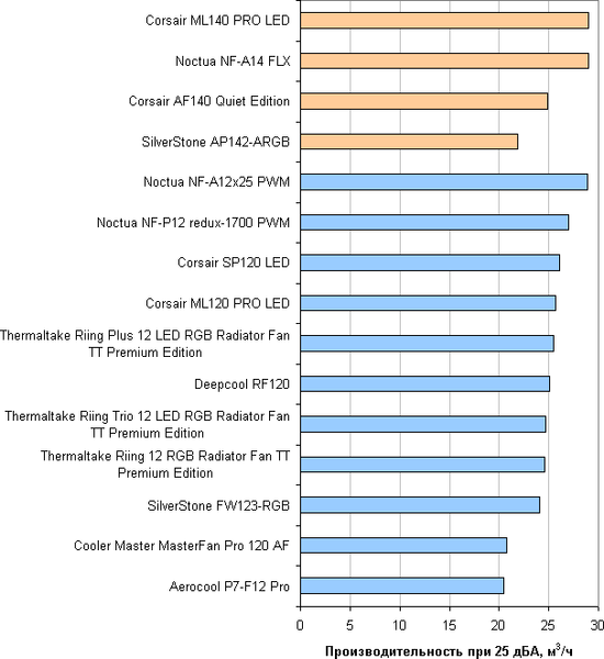 В современных условиях и в потребительском сегменте эргономика, как правило, имеет приоритет над производительностью, поэтому зафиксируем уровень шума на значении 25 дБА. Теперь для оценки вентиляторов достаточно сравнивать их производительность при данном уровне шума.
