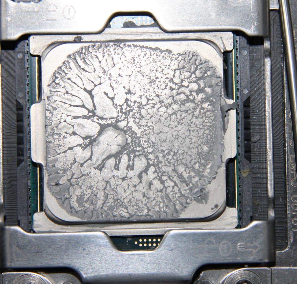 Видно, что термопаста распределилась очень тонким слоем в круге почти до самых краев плоскости крышки процессора, но не попала на углы. Вряд ли это отрицательно сказывается на работе кулера, так как считается, что важнее хорошо охлаждать именно центральную часть крышки процессора.