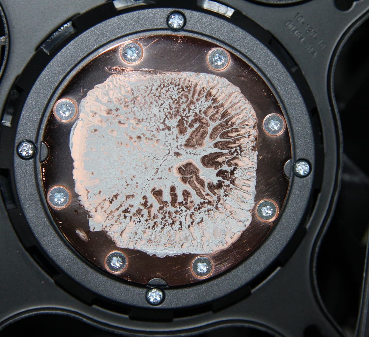 Диаметр этой пластины — 54 мм, а внутренняя часть, ограниченная отверстиями, имеет диаметр примерно 44 мм. Толщину медной подошвы мы не определили, так как часть ее, возможно, утоплена в корпус помпы. Подошва к центру чуть-чуть выпуклая. Центральную часть медного основания занимает нанесенная тонким слоем термопаста. Запаса для ее восстановления в комплекте поставки, к сожалению, нет. Забегая вперед, продемонстрируем распределение термопасты после завершения всех тестов. На процессоре: