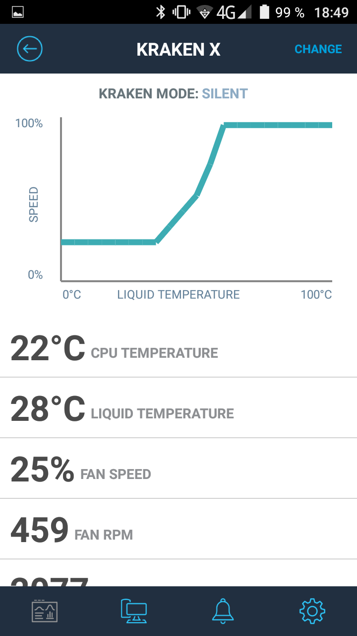 Для контроля и управления работой системы охлаждения используется ПО с кратким названием Cam. Функциональность этого ПО, относящаяся к данной системе, заключается в том, что пользователь может отслеживать текущие значения коэффициента заполнения ШИМ вентилятора, скорости вращения вентилятора и помпы, а также температуру охлаждающей жидкости; выбирать из имеющихся или создавать собственные профили скорости вращения вентиляторов и помпы в зависимости от температуры процессора, графического ускорителя или охлаждающей жидкости.