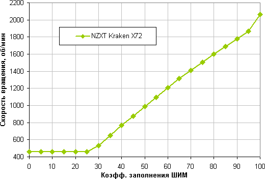 Отличный результат — широкий диапазон регулировки и плавный рост скорости вращения при изменении коэффициента заполнения от 25% до 100%. Отметим, что при КЗ 0% вентиляторы не останавливаются, поэтому в гибридной системе охлаждения с пассивным режимом на минимальной нагрузке такие вентиляторы придется останавливать, снижая напряжение питания.