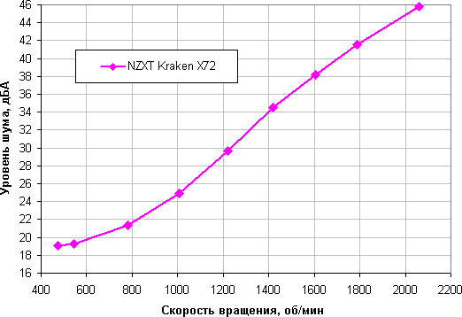 Полное описание методики тестирования приведено в соответствующей статье «Методика тестирования процессорных охладителей (кулеров) образца 2017 года». Для теста под нагрузкой использовалась функция Stress FPU из пакета AIDA64. Потребление процессора при замерах по дополнительному разъему 12 В на материнской плате под нагрузкой меняется от 125,4 Вт при 44,9 °C температуры процессора до 128,2 Вт при 54,0 °C. Для расчета промежуточных значений потребления использовалась линейная интерполяция. Во всех тестах, если не указано иное, помпа работает на скорости 2100 об/мин (так по умолчанию, если помпа просто подключена по USB).