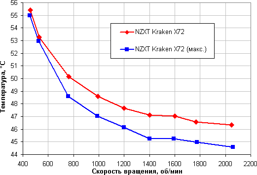 Внимательные читатели могут сравнить это значение, с результатом в 190 Вт, полученным при тестировании системы NZXT Kraken X52 на два вентилятора 120 мм. На первый взгляд результат парадоксальный, так как радиатор на два вентилятора работает лучше, чем на три таких же вентилятора. Логичное объяснение заключается в том, что в тесте с NZXT Kraken X52 нагрузка создавалась с помощью программы Prime95, которая, по всей видимости, нагружает процессор больше, но греет области с датчиками температуры ядер меньше, чем следует ожидать, исходя из прироста мощности в сравнении с функцией Stress FPU из пакета AIDA64. Получается, что, если сравнивать системы охлаждения при тестировании по данной методики, то необходимо фиксировать много условий, включая ПО для создания нагрузки.