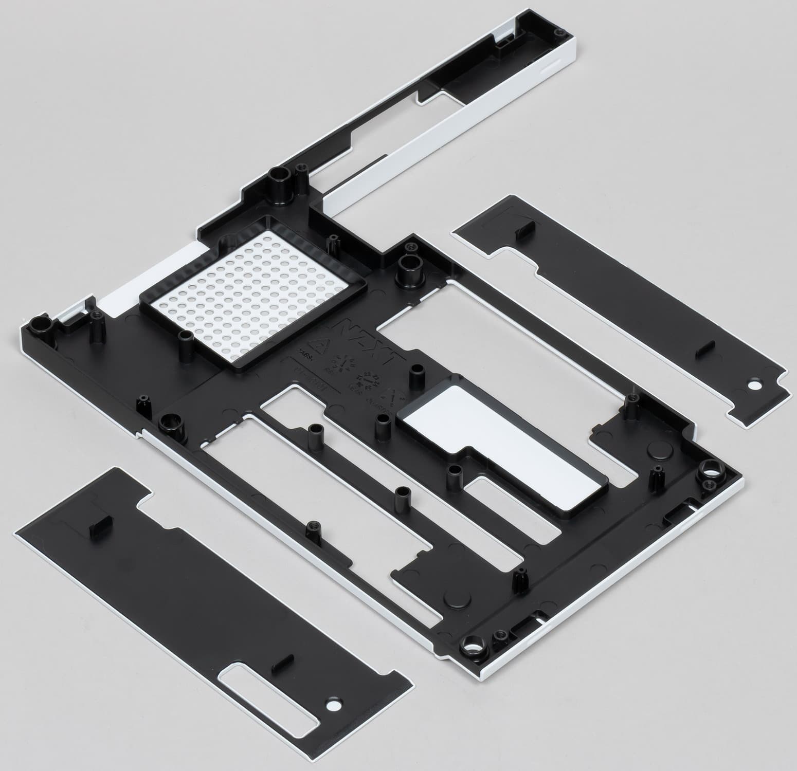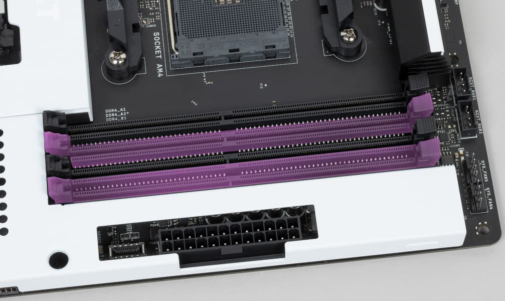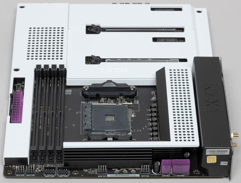 Форм-фактор ATX имеет размеры до 305×244 мм, а E-ATX — до 305×330 мм. Материнская плата NZXT N7 B550 имеет размеры 305×244 мм, поэтому выполнена в форм-факторе ATX, и на ней имеются 10 монтажных отверстий для установки в корпус, однако реально можно использовать — 9 (10е скрыто декоративным «панцирем»).