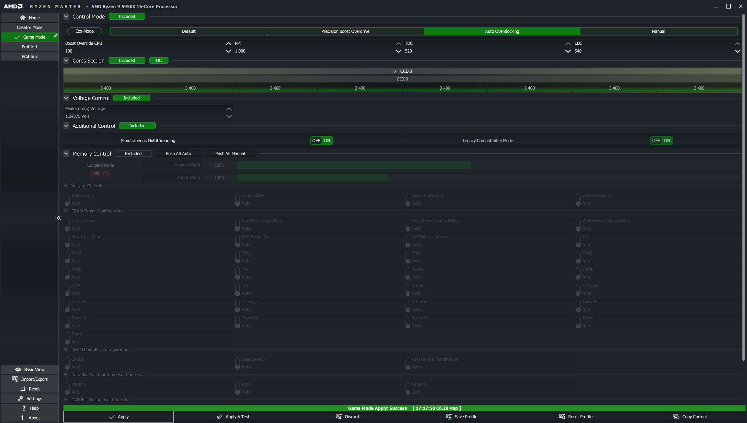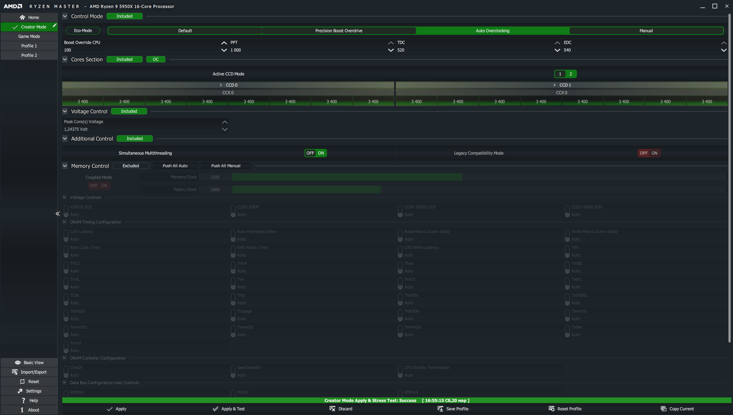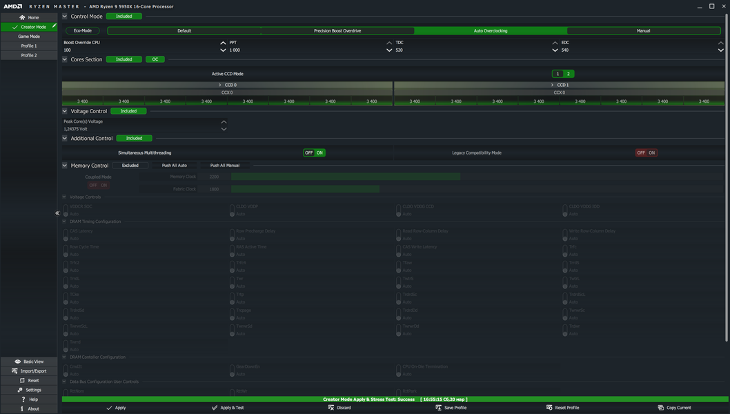 Однако не просто же есть утилита от AMD — Ryzen Master, и если партнеры AMD не предоставляют свои утилиты или особые параметры автооверклокинга, то впору воспользоваться этой программой. Она имеет два основных режима работы Ryzen: Creator Mode (где идет оптимизация и определение максимумов работы по всем ядрам процессора, что у него есть) и Game Mode (где в случае с 5950Х урезается половина ядер, ну собственно, половина CCD, а в случае с процессорами 5900Х и 5600Х урезаются CCD с отключенными аппаратно ядрами). Начнем с Creator Mode.
